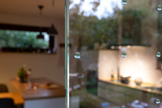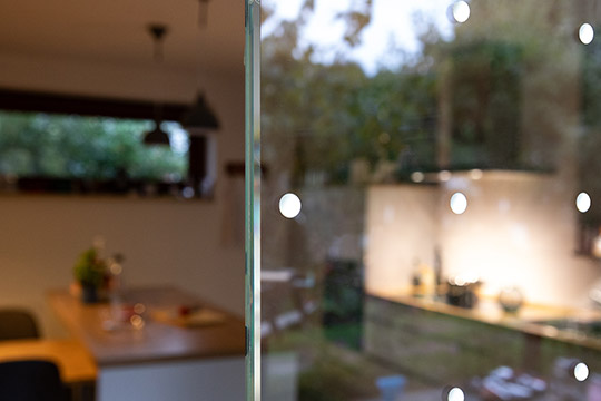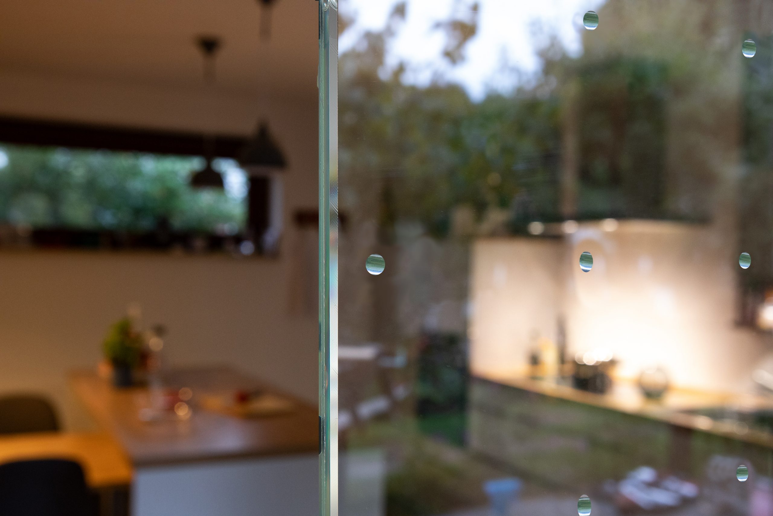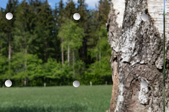 The light-absorbing and color-neutral back of the dots guarantees minimal irritation on the room side. The metallic, three-dimensional front gives the glass an elegant and lively surface.